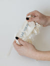 I loved working with the bride to hand make and personalize this ivory wedding garter. First, the garter started with a layer of ivory satin and ivory lace. On the inside, I personalized the garter with hand embroidery in dusty blue. I featured the couple's initials and wedding date.