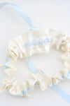 A personalized garter for the bride. I loved working with this bride to personalize this ivory and blue wedding garter for her. On the inside, I personalized the garter with hand embroidery - she chose to have her name embroidered in light blue.