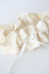 If you love sentimental items you'll love this wedding garter heirloom I made for my bride. I worked with her Grandmother's wedding dress to hand make this custom wedding garter using lace and buttons from the dress. It's a beautiful lace texture throughout this wedding garter design and buttons at the back to mimic the dress design. At the center and the front I finished the design with a simple ivory bow.