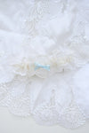 Every bride deserves a beautiful heirloom that's made just for her - and this one is no exception! I loved working with this bride and her Mother's wedding dress lace to create this custom wedding garter for her wedding day. It's a beautiful garter straight from her mom's wedding dress lace. At the center I finished the design with a dainty light blue bow. On the inside I personalized this garter for the bride with hand embroidery detailing her wedding date.