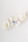 I loved working with this bride and her Mom's dress sleeve to hand make this lace wedding garter with pearls. I finished the garter with a dainty blue bow at the center.