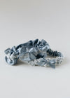It was an honor working with my bride to personalize this dusty blue wedding garter with hand embroidered details.