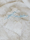 This beautiful garter set, ring pillow and hanky are all wedding heirlooms made from the bride's Mother's wedding dress. Her beautiful wedding garter features lace with pearls and a blue stripe and bow. The delicate lace was from her Mom's wedding dress. It's a great way to re-use your Mom's wedding dress without having to wear it! I also made a matching tossing garter, because as the bride your garter is too pretty to toss.