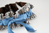 I loved working with the bride to hand make her a personalized wedding garter heirloom set for her big day. The gorgeous custom wedding garter features the colors that the bride chose, brown and blue. This color combo paired with the ivory lace turned out beautifully.