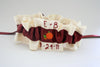 This a wedding garter set. The main garter is ivory satin with a burgundy grosgrain stripe and a burgundy satin bow that ties in the back. It is hand embroidered with the couple's initials and wedding date as well as a pumpkin and a few leaves. The matching tossing garter is burgundy grosgrain with a burgundy satin bow that ties in the back.
